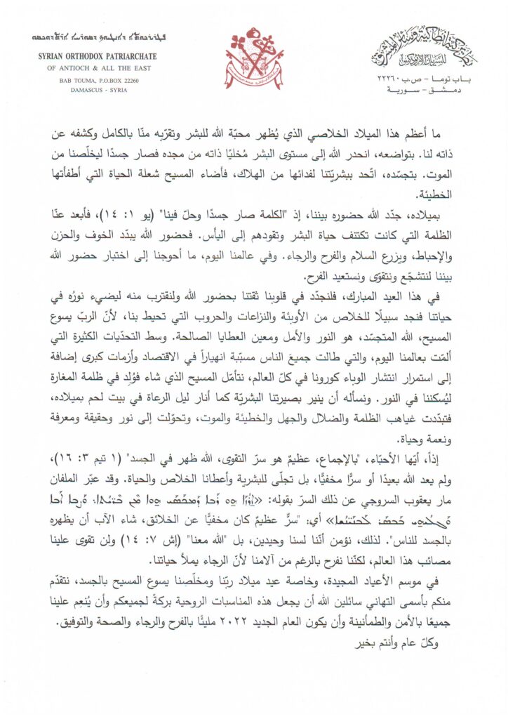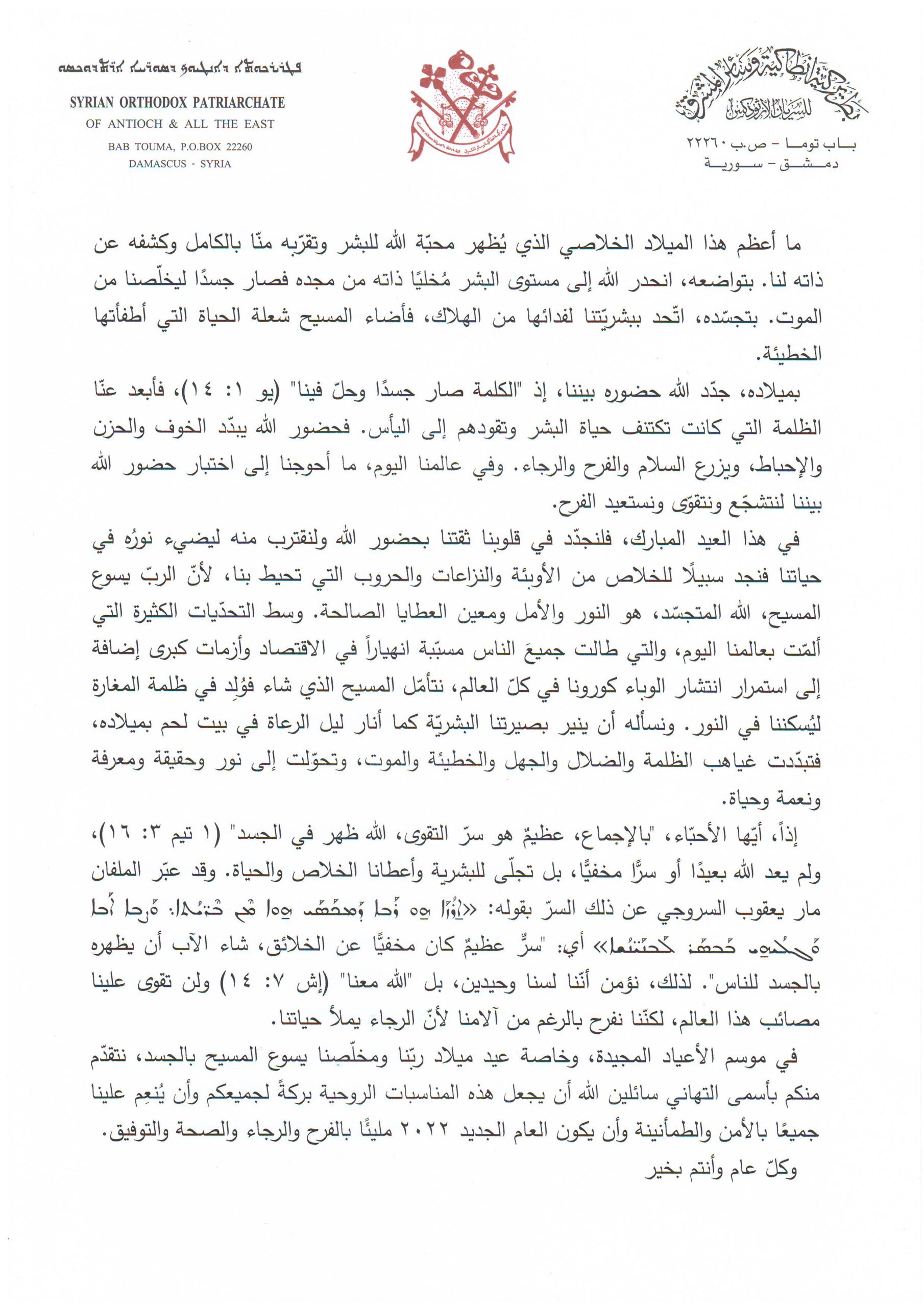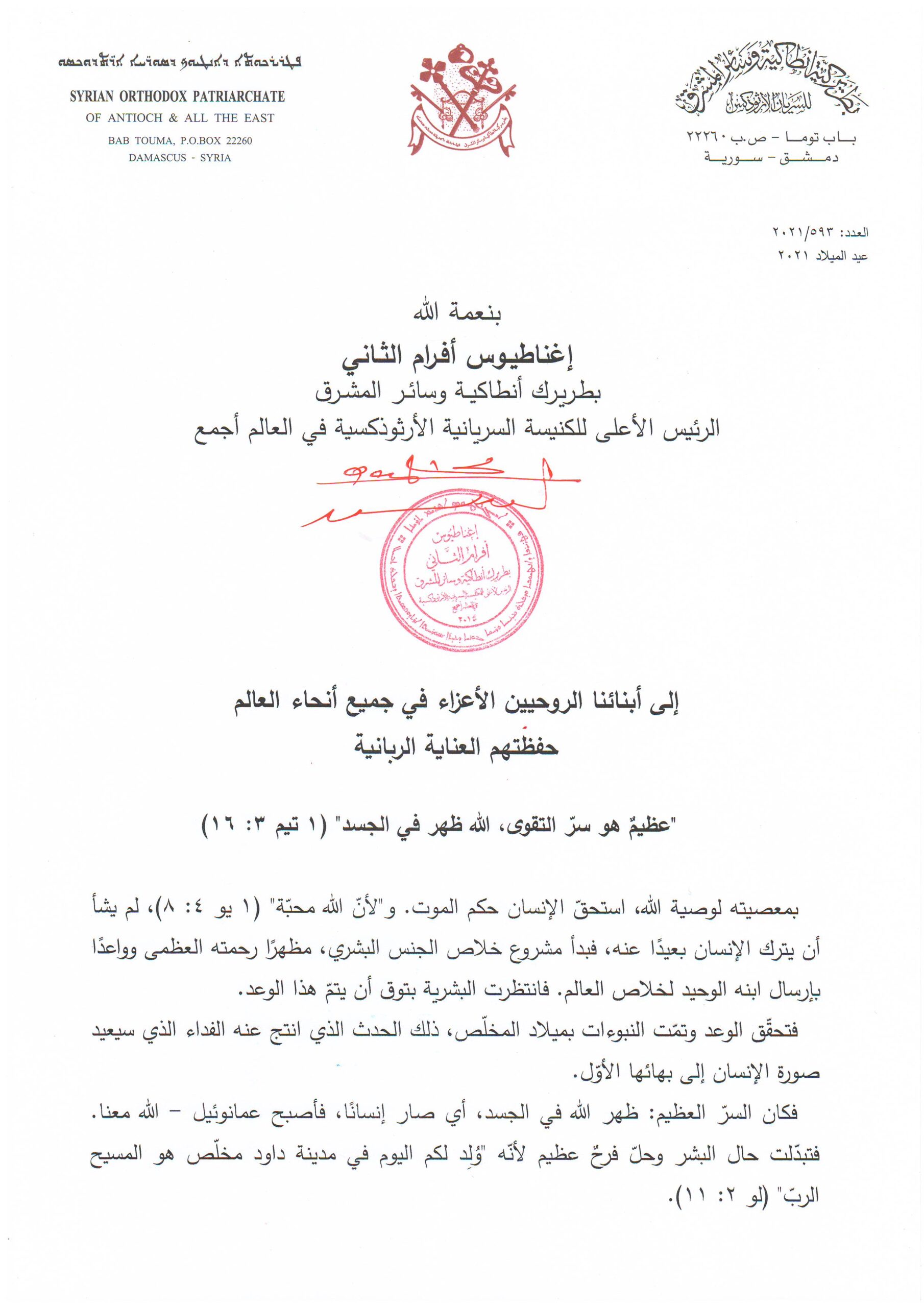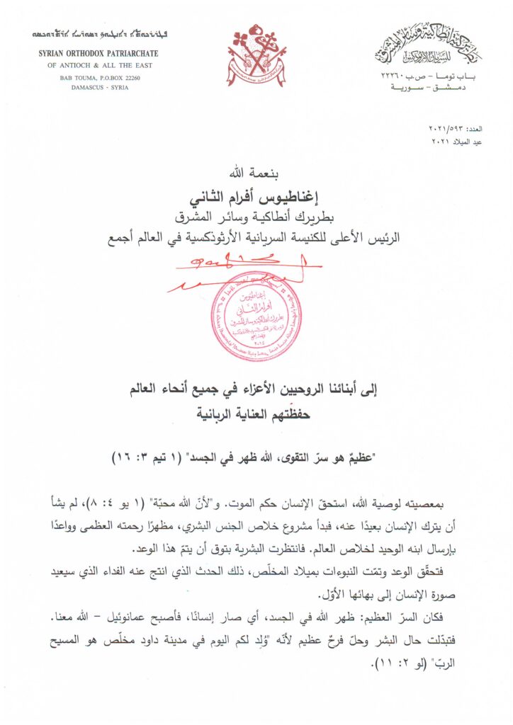 2021 Christmas Message from His Holiness Patriarch Mor Ignatius Aphrem II (Arabic) 22 Dec December 22, 2021 Nehrin Akyon