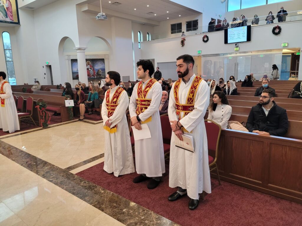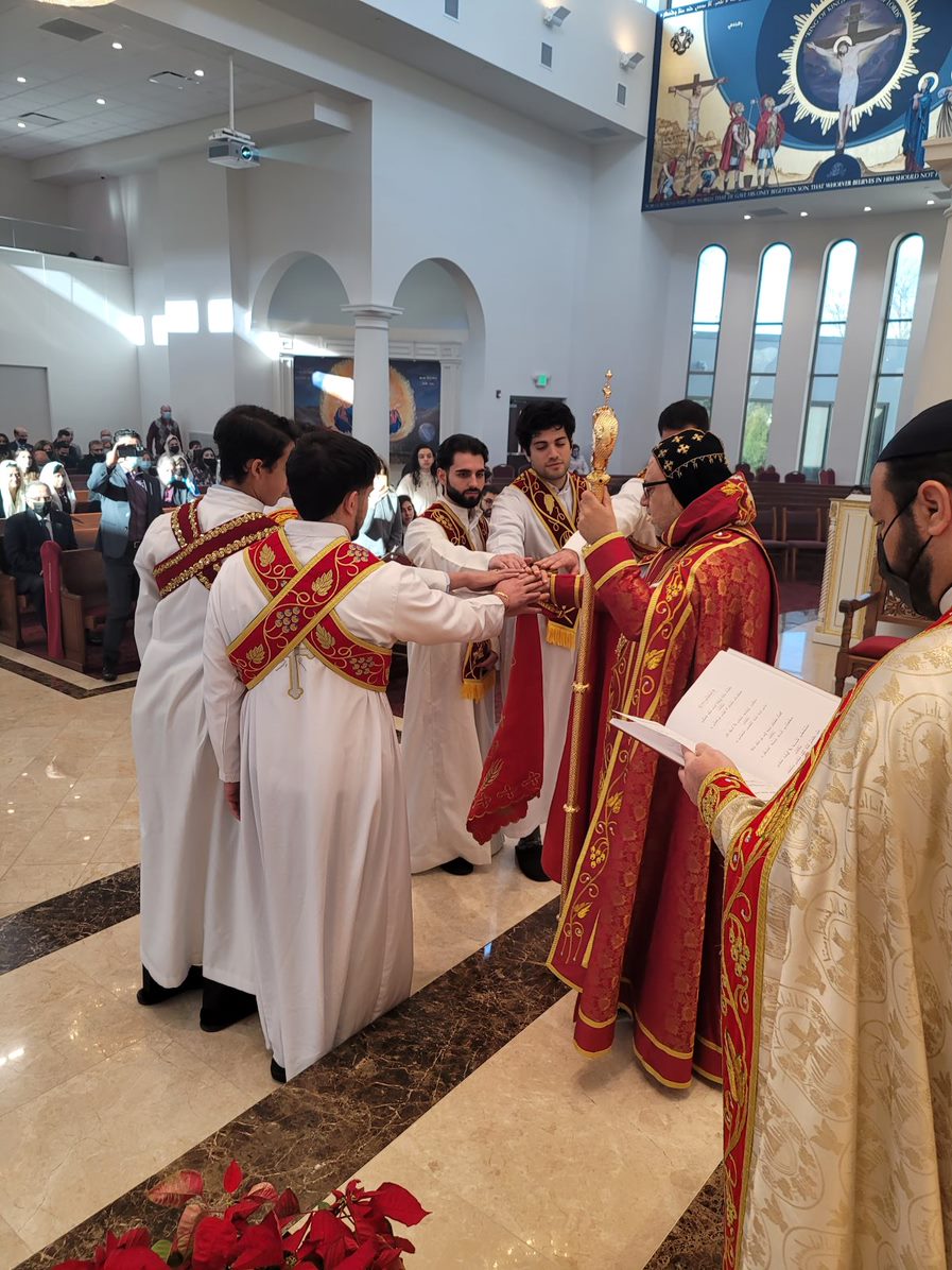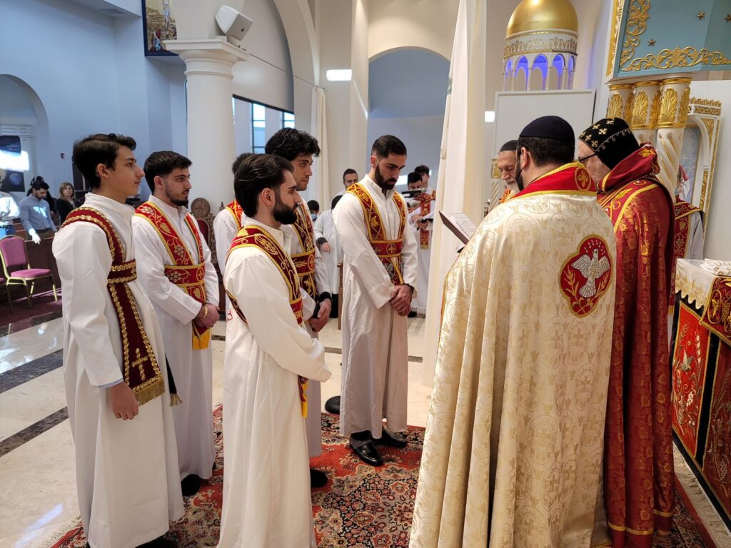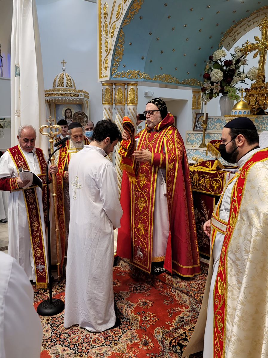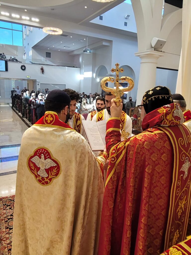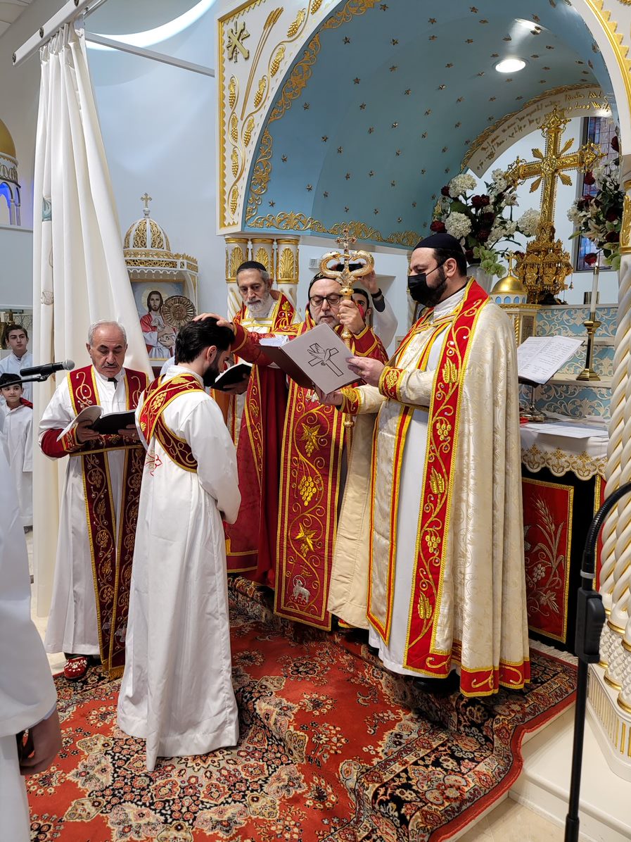On Sunday December 19, 2021, His Eminence Mor Dionysius John Kawak assisted by Very Rev. Fr. Joseph Chamoun the Parish Priest and Rev. Fr. Gabriel Alkass, celebrated the Holy Qurobo at St. Mark’s Cathedral in Paramus, New Jersey. During the Qurobo, His Eminence ordained Gabriel Fermano, John Hanna, Stephen Mourad, Andrew Fermano, Gabriel Mourad, and Sebastian (Kenoro) Kiraz from the rank of Readers to the rank of Sub Deacons (Afidyakno). In his sermon, he spoke about the importance of serving the church as a deacon everyday by giving to the needy as well as visiting the sick to be a true disciple of Christ. He then congratulated the families and the deacons on their ordination.